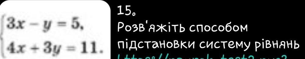 3x - y = 5 \\ 4x + 3y = 11 \\  \\ y = 3x - 5 \\ 4x + 9x - 15 = 11 \\  \\ y = 3x - 5 \\ 13x = 26 \\  \\ y = 6 - 5 \\ x = 2 \\  \\ y = 1 \\ x = 2