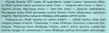 Мухтар Әуезов 1897 жылы 28 кыргүйенте казіргі Шығыс Қазақстан облы сы Абай ауданы Берiлi ауылында туған.Унем хабарласып , араласып отырган .« Абай жолы » атты терт томдык роман - эпопея Романның 1 - томы Абайдын балалық шағынан бас талады Жазушы бала Абайдың отбасы , анеге алған ортасы , шәкірттері жайлы жазды . Ал романның 4 - томы Абайдың қайтыс болуымен аяқталады