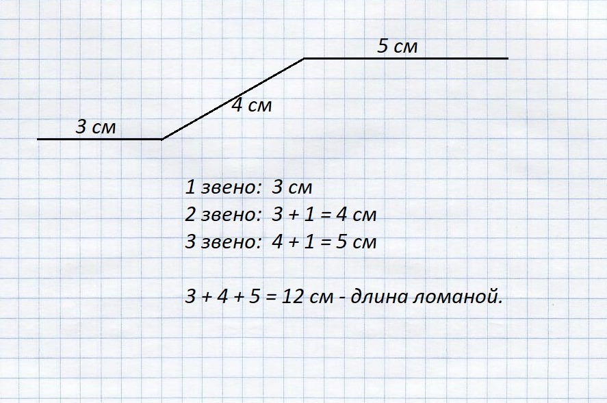 Начерти ломаную из трех звеньев так.чтобы длина первого звена была равна 3 см.а каждое следующее звено было на 1 см длиннее предыдущего .Найди длину этой ломаной