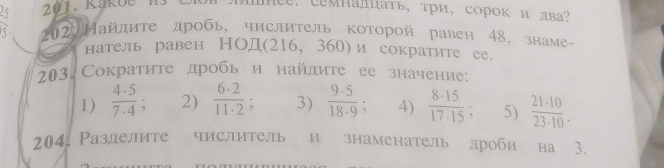 203. Сократите дробь и найдите ее значение: 6.2 4.5 2) 11.2' 3) 1) 7.4 4) 9.5 18.9⁹ 8.15 17.15 ; 5) 21.10 23.10. ПОМОГИТЕЕЕЕ С ЗАДАНИЕМ 203