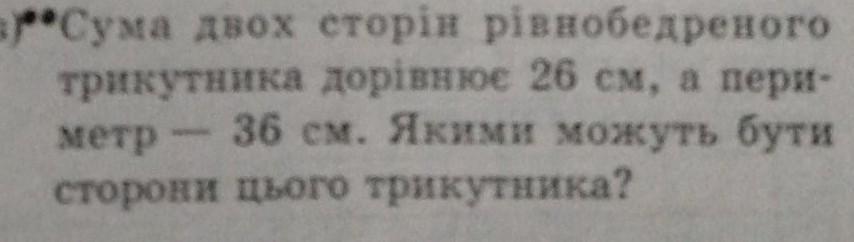 Сума двох сторін рівнобедреного трикутника дорівнює 26 см,периметр дорівнює 36 см.Якими можут бути сторони цього трикутника?