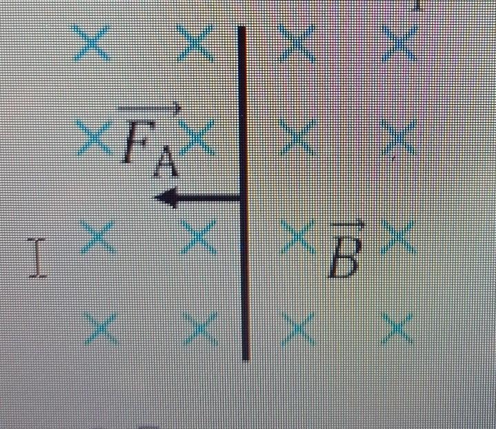 Пояснення: за правилом лівої руки, якщо сила Ампера напрямлена вліво та лінії магнітної індукції від нас, то сила струму напрямлена вгору.