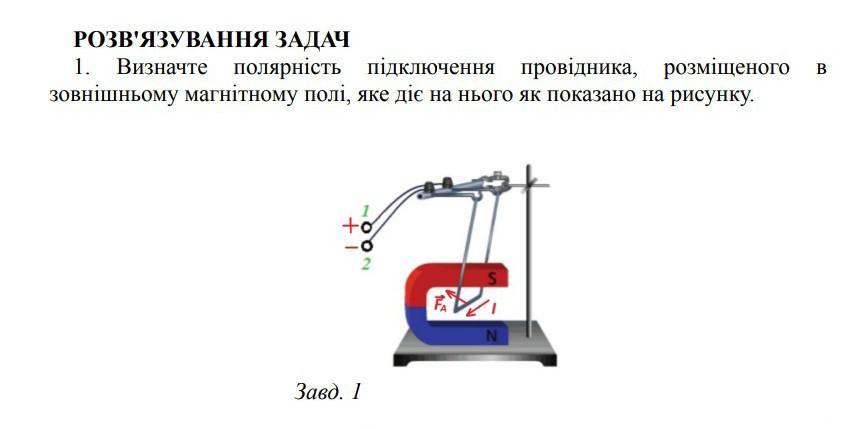 1. Визначте полярність підключення провідника, розміщеного зовнішньому магнітному полі, яке діє на нього як показано на рисунку.