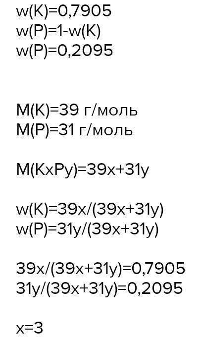 СРОЧНОООООО!!!!!!!!!!!!!!!!!!!!!!!!!!!!!!! Масова частка Калію в його сполуці з Фосфором становить 79,05 %. Виведіть формулу сполуки.