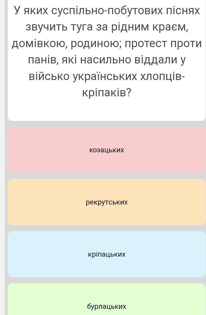 У яких суспільно-побутових піснях звучить туга за рідним краєм, домівкою, родиною; протест проти панів, які насильно віддали у вiйсько українських хлопців- кріпаків? козацьких рекрутських кріпацьких бурлацьких?пж поможіть срочнрр