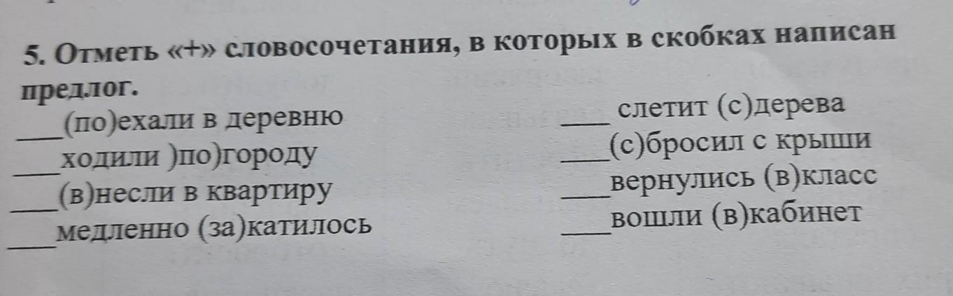 5. Отметь «+» словосочетания, в которых в скобках написан предлог. (по)ехали в деревню ходили )по городу (в)несли в квартиру медленно (за)катилось слетит (с)дерева (с)бросил с крыши вернулись (в)класс вошли (в)кабинет