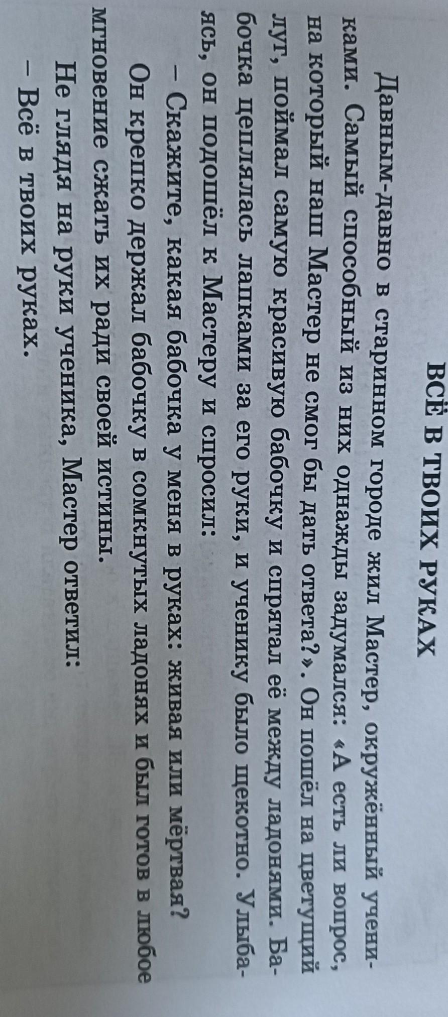 Наверняка ученик решил "подшутить" над учителем. Если бы тот сказал "мёртвая" он бы просто разжал ладони и выпустил живую бабочку. Если бы учитель сказал "живая" - ученик сильнее сжал бы ладони и убил бабочку. Но учитель, предугадал обе ситуации и не пошёл на повод ученика ,а дал ученику выбор ответственности за жизнь бабочки своими словами "Всё в твоих руках"