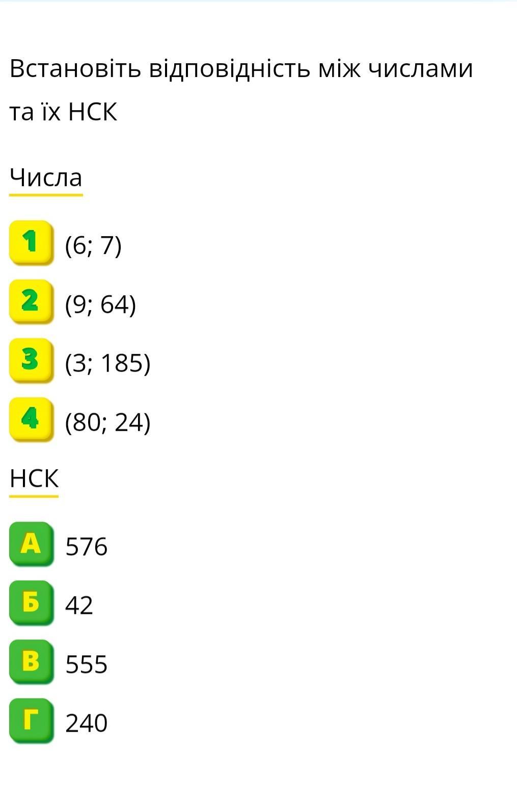 Встановіть відповідність між числами та їх НСК Числа 1 2 3 4 НСК (6; 7) (9; 64) (3; 185) (80; 24) A 576 Б 42 в 555 Г | 240