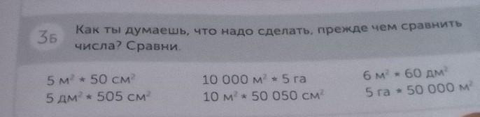 ЗБ Как ты думаешь, что надо сделать, прежде чем сравнить числа? Сравни. 5 м² + 50 см² 5 дм² * 505 см² 10 000 м² * 5 га 10 м² * 50 050 см² 6 м * 60 дм 5 ra * 50 000