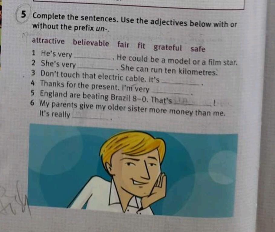 5. Complete the sentences . Use the adjectives below with or without the prefix un- .