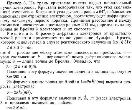 На грань кристалла никеля падает параллельный пучок электронов. Кристалл поворачивают так, что угол скольжения ϑ изменяется. Когда этот угол делается равным 64°, наблюдается максимальное отражение электронов, соответствующее дифракционному максимуму первого порядка. Принимая расстояние d между атомными плоскостями кристалла равным 200 пм, определить длину волны де Бройля λ электронов и их скорость v.