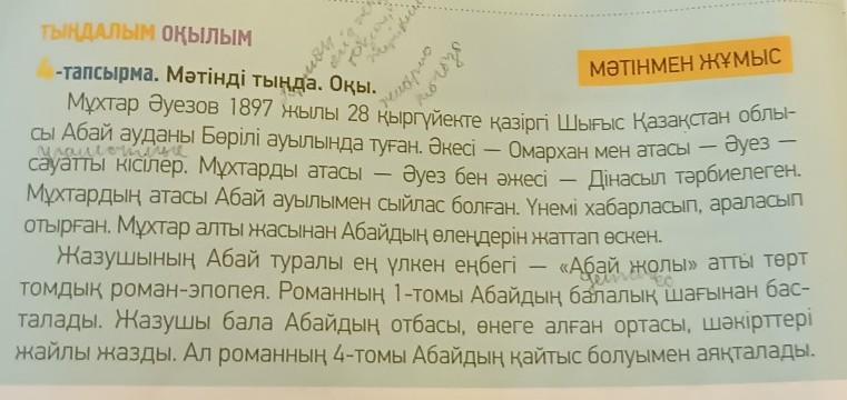 1. Мұхтар Әуезов - кiм? 2. Мұхтарды кім тәрбиеледі? 3. Мұхтардың Абайды тануына не себеп болды? 4. Болашақ жазушы Абайдың өлеңдерін неше жасынан жаттап өсті? 5. Романның бірінші томы неден басталады? 6. Роман калай аякталады? ответьте пожалуйста по тексту