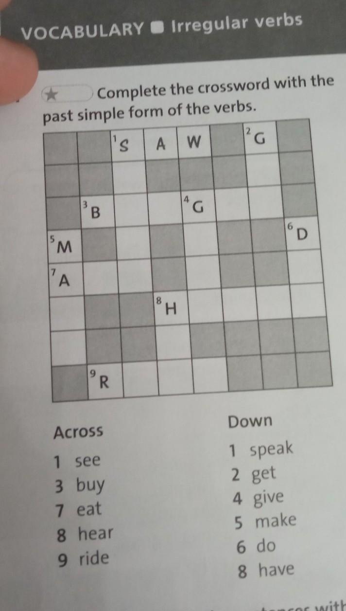 20 баллов Complete the crossword with the past simple form of the verbs. 's A W 1★ M 7 A B R Across 1 see 3 buy 7 eat 8 hear 9 ride H 'G G Down 1 speak 2 get 4 give 5 make 6 do 8 have 6 D