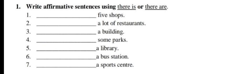 Помогие пожалуста 1. Write affirmative sentences using there is or there are. 1. five shops. 2. a lot of restaurants. 3. a building. 4. some parks. 5. a library. 6. a bus station. 7. a sports centre.