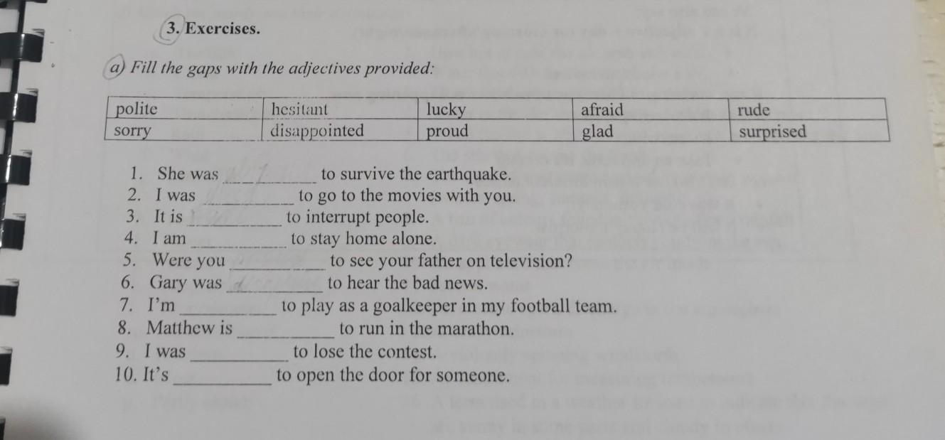Fill the gaps with the adjectives provided: polite sorry 1. She was 2. 3. 4. I was It is I am 5. Were you 6. Gary was 7. I'm 8. Matthew is 9. I was 10. It's hesitant disappointed lucky proud to survive the earthquake. to go to the movies with you. to interrupt people. to stay home alone. to see your father on television? to hear the bad news. afraid glad to play as a goalkeeper in my football team. to run in the marathon. to lose the contest. to open the door for someone. rude surprised