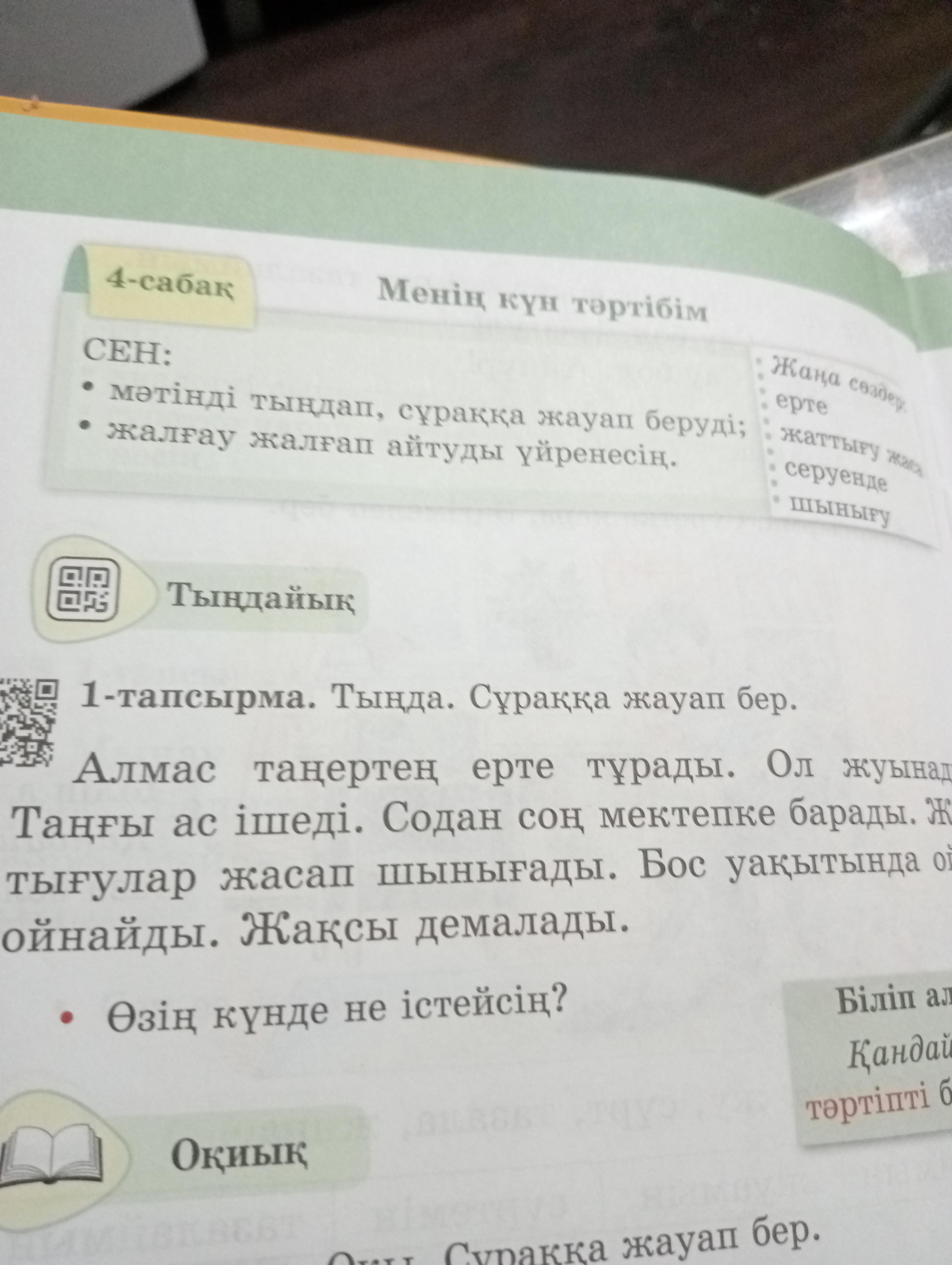 например в тексте написано что мальчик по имени Алмас каждый день встаёт рано утром потом умывается потом завтракает и т.д. и ты должна так же написать что ты делаешь каждый день