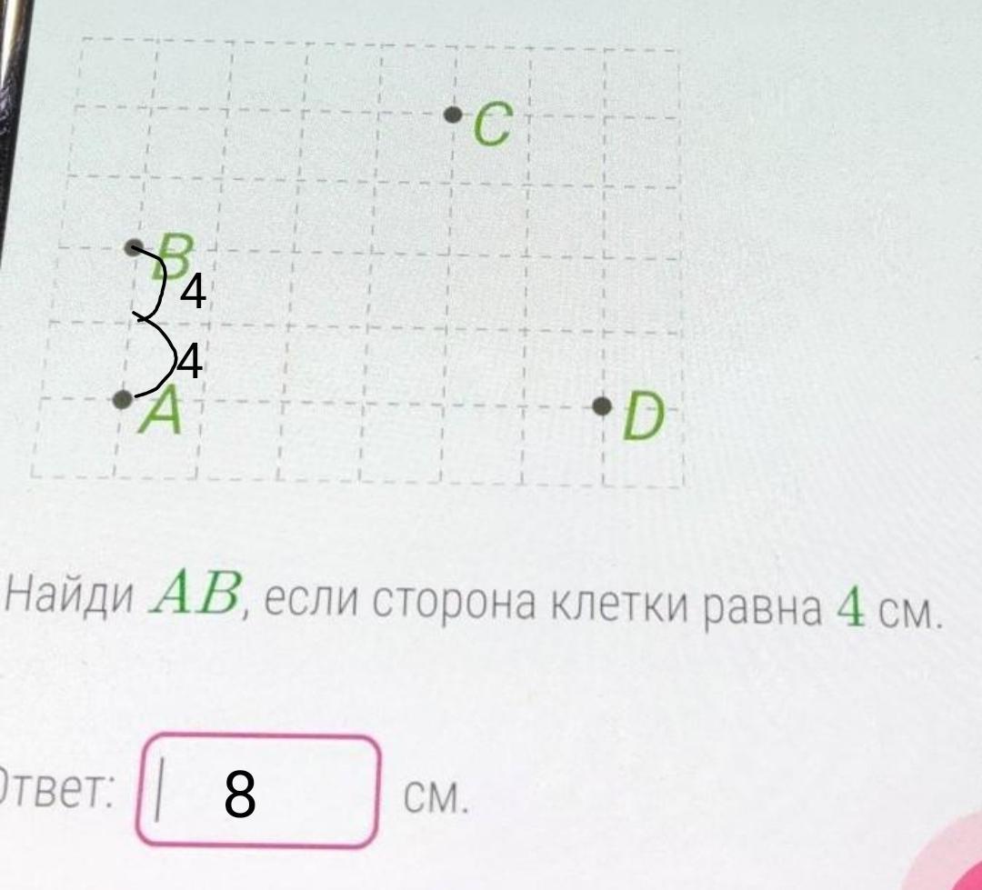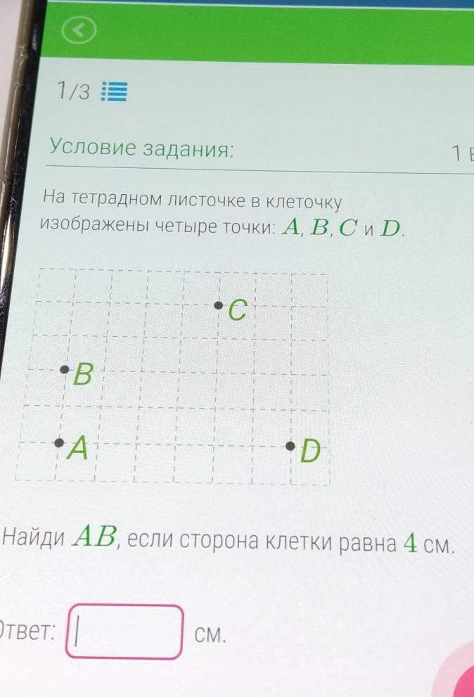 На тетрадном листочке а в клеточку изображены четыре точки a b c и d найди AB если сторона клетки равна 4 см