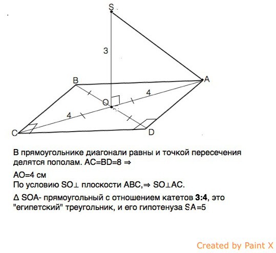 Δ SOA- прямоугольный с отношением катетов 3:4, это "египетский" треугольник, и его гипотенуза SА=5 ( можно проверить по т.Пифагора)