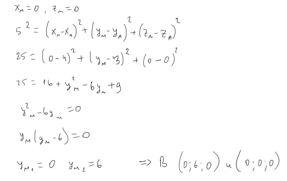 На осі ординат знайдіть точку М, відстань від якої до точки А(4; 3; 0) дорівнює 5.