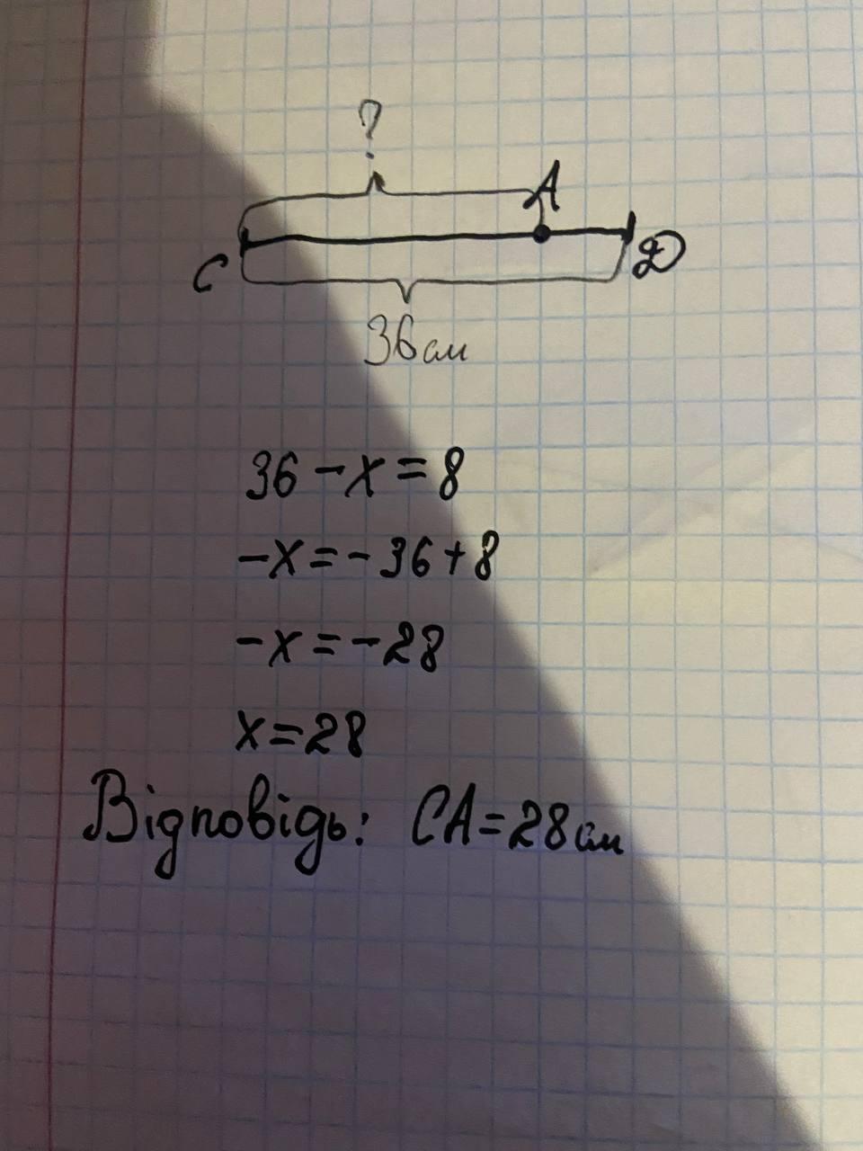 Точка А належить відрізку CD=36 см. Знайдіть довжину відрізка СА, якщо різниця між AD і AC дорівнює 8см