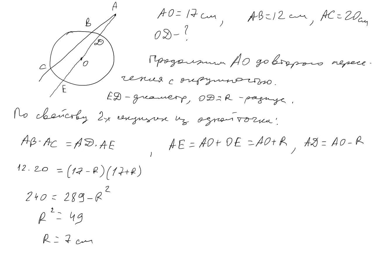 Із точки поза колом проведено січну, яка перетинає коло в точках, що віддалені від даної точки на 12 і 20 см. Відстань від даної точки до центра коли дорівнює 17 см. Визначити радіус кола.
