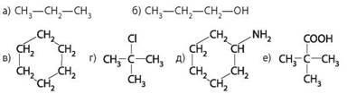 1)Серед наведених структурних формул сполук укажіть: вуглеводні, циклічні сполуки, спирт, карбонову кислоту, амін.