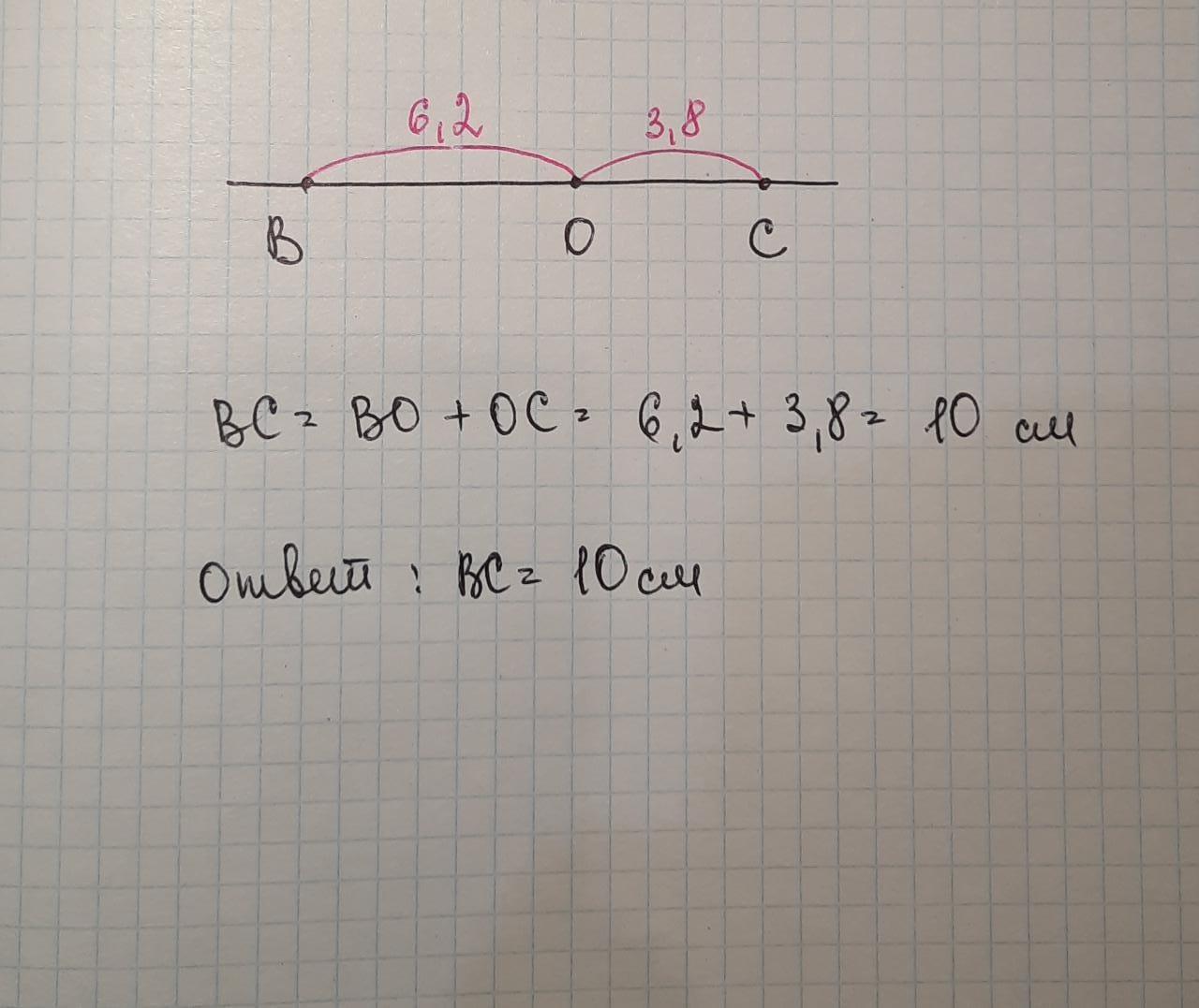 точка О лежить на прямій між точками В і С. Знайти довжину відрізка ВС, якщо ВО=6,2 см, ОС=3,8ст. помогите пж самостійна робота