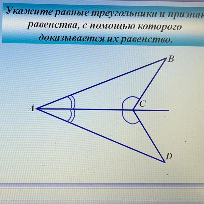 треугольник ADC равен треугольнику ABC. Треугольники равны между собой по второму признаку равенства: сторона и два прилегающих к ней угла.