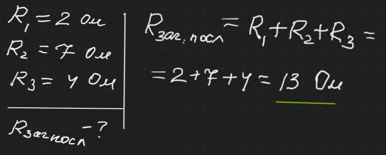 визначтезагальний опір якщо три резистори зеднпли послідовно опори резисторів дорівнюють 2 ом,7 Ом та 4 ом
