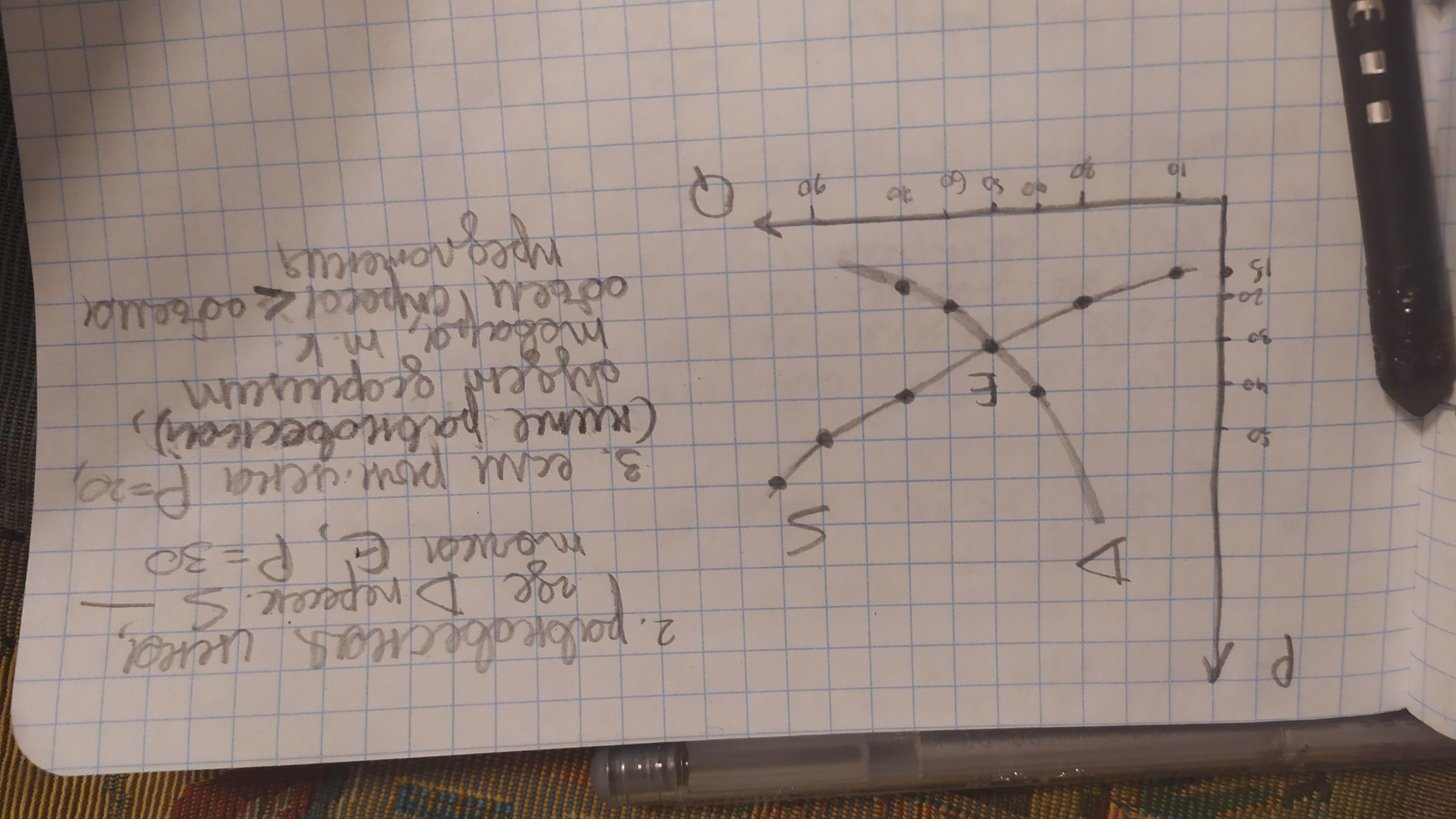 по иксам - объем выпуска, по игрикам - цена, строим по табличке. где пересеклись D и S - равновесие. ниже Е дефицит, выше - профицит