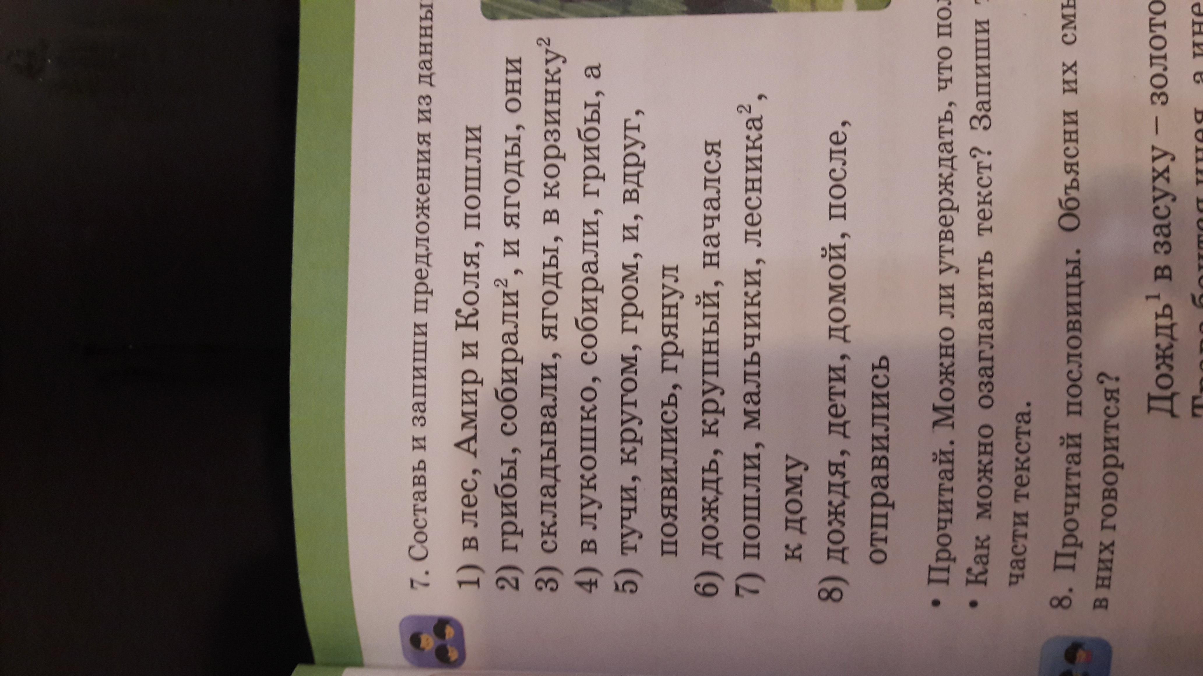 Амир и Коля пошли в лес. Они собирали грибы и ягоды. Ягоды складывали в корзинку, а грибы собирали в лукошко. Кругом появились тучи, и вдруг грянул гром. Начался крупный дождь. Мальчики пошли к дому лесника. После дождя, дети отправились домой.