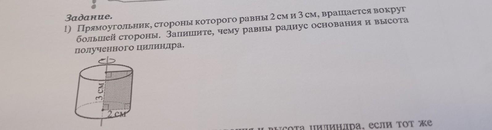 1) Прямоугольник, стороны которого равны 2 см и 3 см, вращается вокруг большей стороны. Запишите, чему равны радиус основания и высота полученного цилиндра