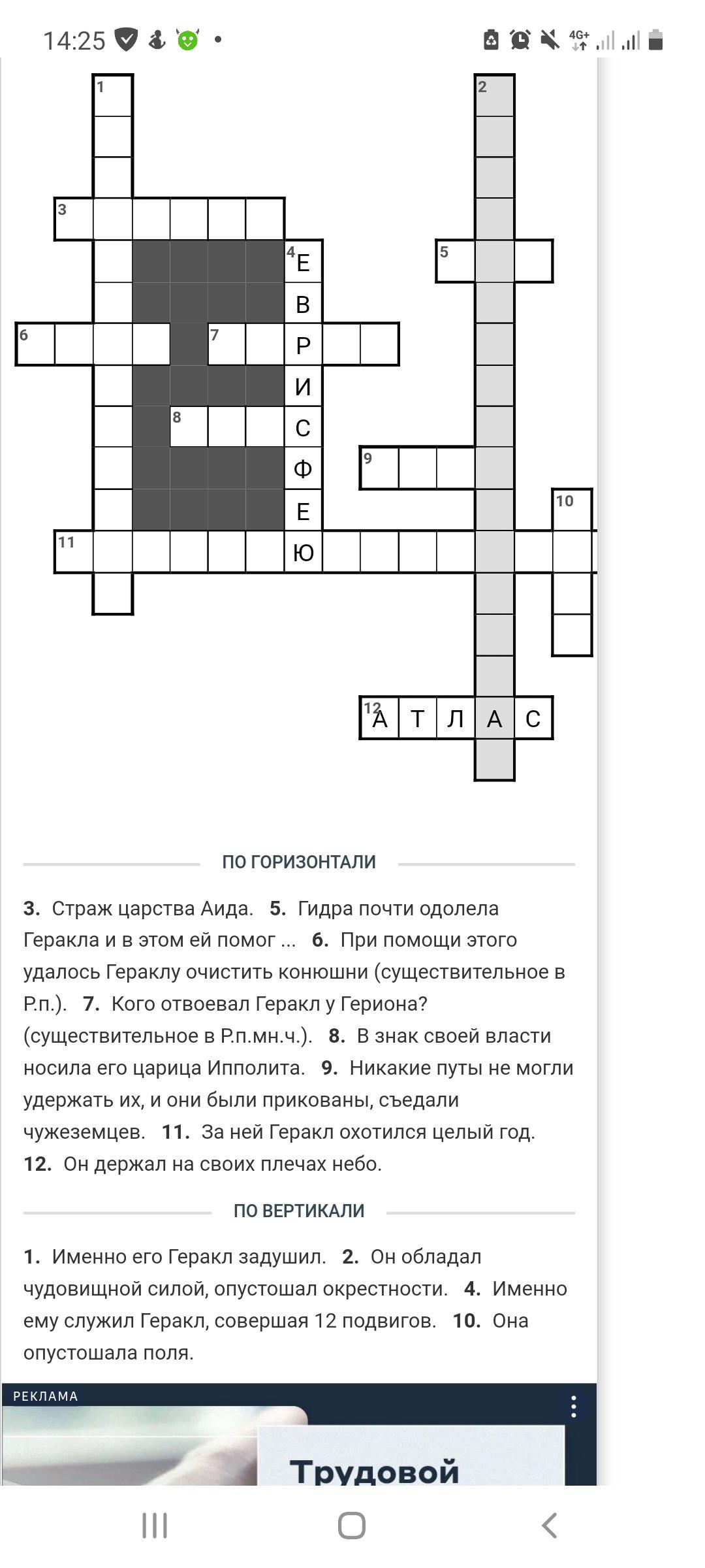 3. Страж царства Аида. 5. Гидра почти одолела Геракла и в этом ей помог ... 6. При помощи этого удалось Гераклу очистить конюшни (существительное в Р.п.). 7. Кого отвоевал Геракл у Гериона? (существительное в Р.п.мн.ч.). 8. В знак своей власти носила его царица Ипполита. 9. Никакие путы не могли удержать их, и они были прикованы, съедали чужеземцев. 11. За ней Геракл охотился целый год. 12. Он держал на своих плечах небо.