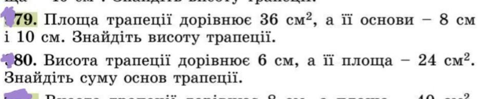 79. Площа трапеції дорівнює 36 см2, а її основи і 10 см. Знайдіть висоту трапеції. 80. Висота трапеції дорівнює 6 см, а її площа Знайдіть суму основ трапеції. - - 8 см 24 см2.