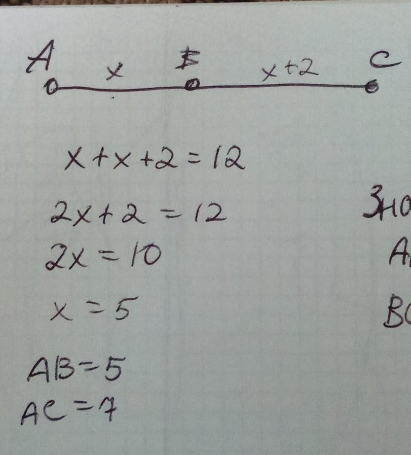 На відрізку АС позначено точку В. Знайдіть довжини відрізків АВ та ВС, якщо ВС більший за АВ на 2 см, а відрізок AC дорівнює 12 см. 5 см 6 см 7 см 8 см