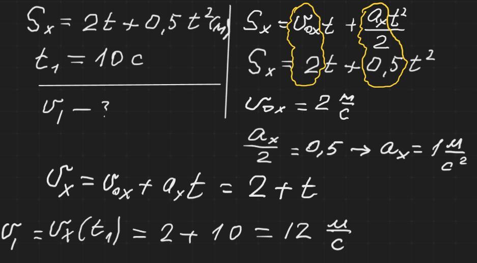 Рівняння проєкції переміщення автомобіля має вигляд Sx=2t+0.5t^2 (у рівнянні значення всіх величин подано в системі СІ). Визначте швидкість руху автомобіля через 10 с після початку руху. Відповідь запишіть у метрах за секунду (м/с), але лише числове значення без одиниці величини.
