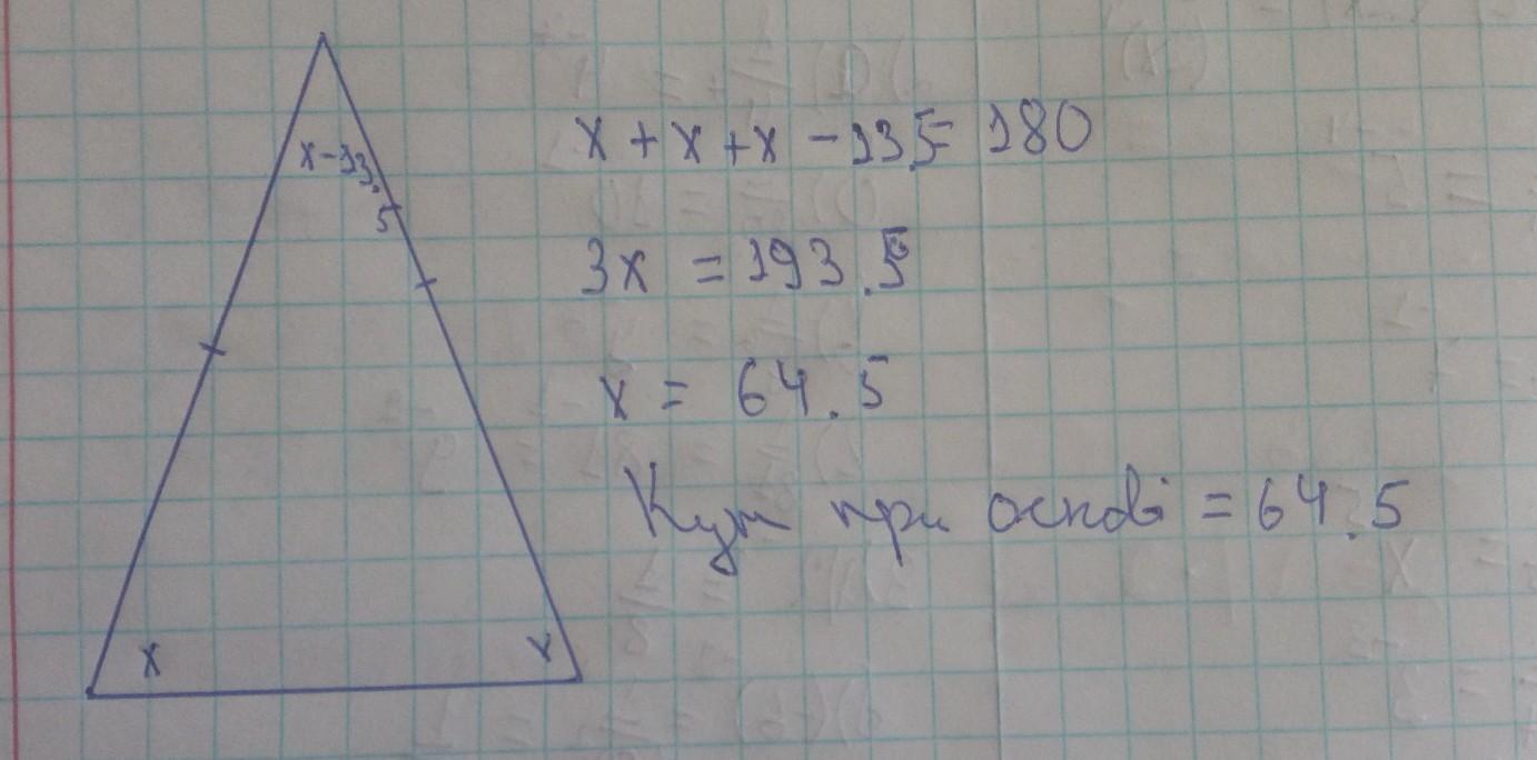 Якщо кут при вершині на 13,5°менший, ніж кут при основі, то в рівнобедреному трикутнику кут при основі дорівнює...