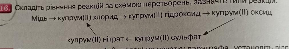16. Складіть рівняння реакцій за схемою перетворень, зазначте типи реакцій. Мідь → купрум(II) хлорид → купрум(II) гідроксид → купрум(II) оксид купрум(II) нітрат — купрум(II) сульфат podo VOTQUORITL Pinnoin.