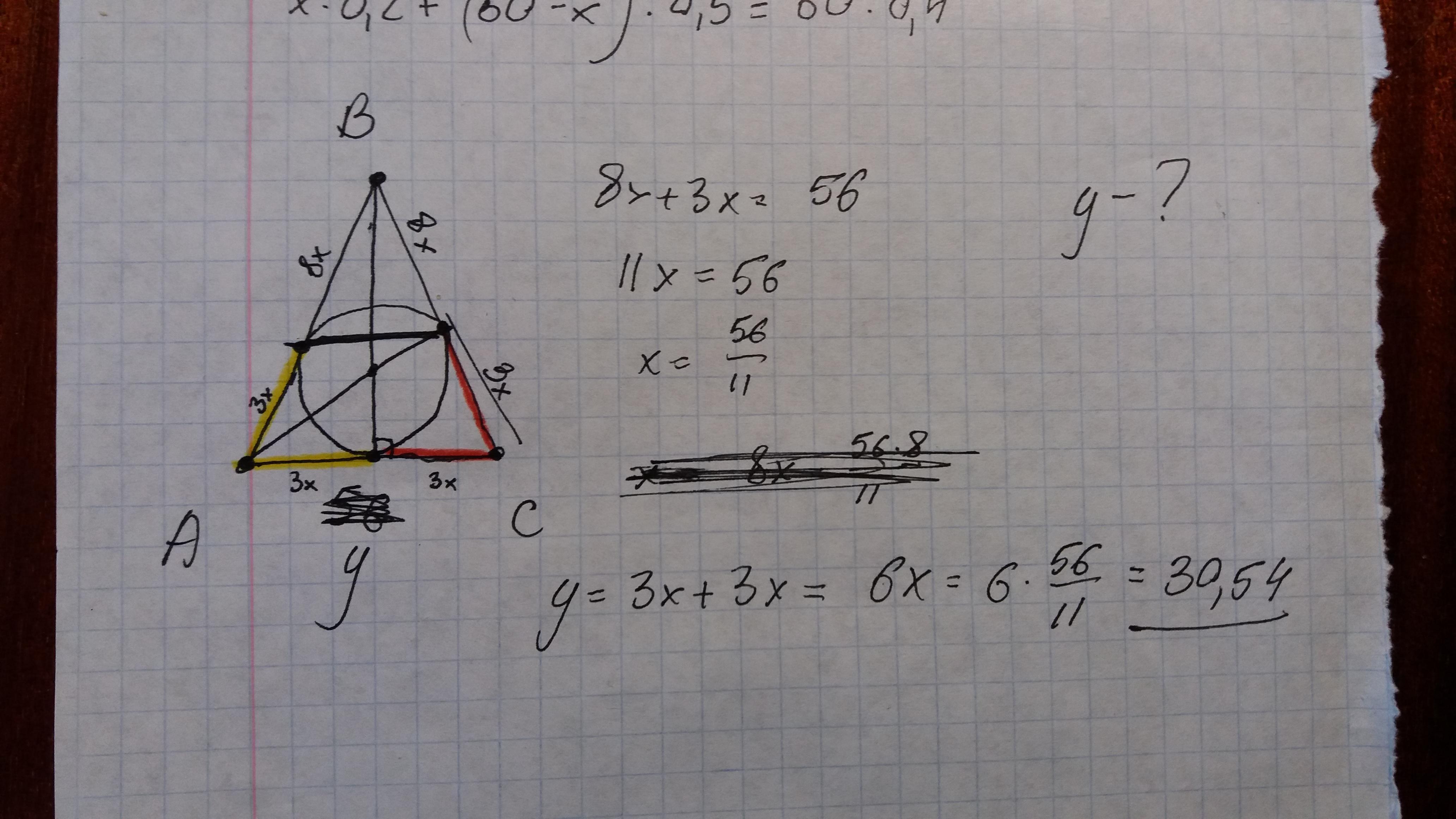 Помогитееее Бічна сторона рівнобедреного трикутника ділиться точкою дотику вписаного кола у відношенні 3 : 8, рахуючи від вершини кута при основі трикутника. Знайдіть основу трикутника, якщо його бічна сторона дорівнює 56 см.