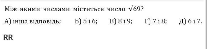 Між якими числа А) інша відповідь; RR міститься Б) 5 1 6; число √69? B) 8i 9; г) 7 i 8; Д) 6 1 7.