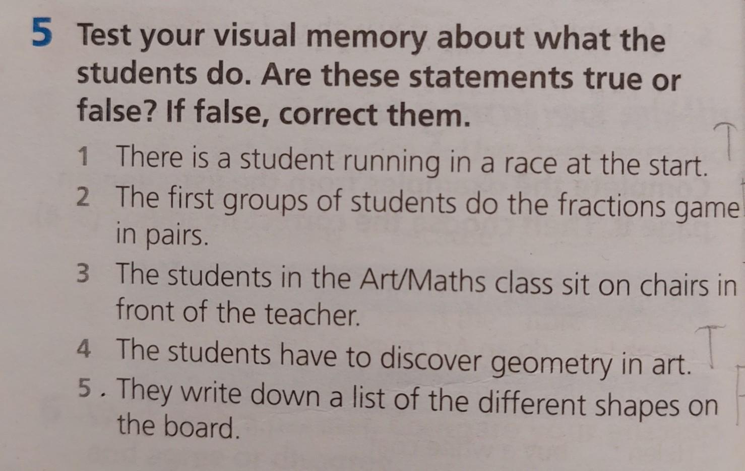 5 Test your visual memory about what the students do. Are these statements true or false? If false, correct them. 1 There is a student running in a race at the start 2 The first groups of students do the fractions gam in pairs. 3 The students in the Art/Maths class sit on chair front of the teacher. 4 The students have to discover geometry in ar 5. They write down a list of the different shape the board.
