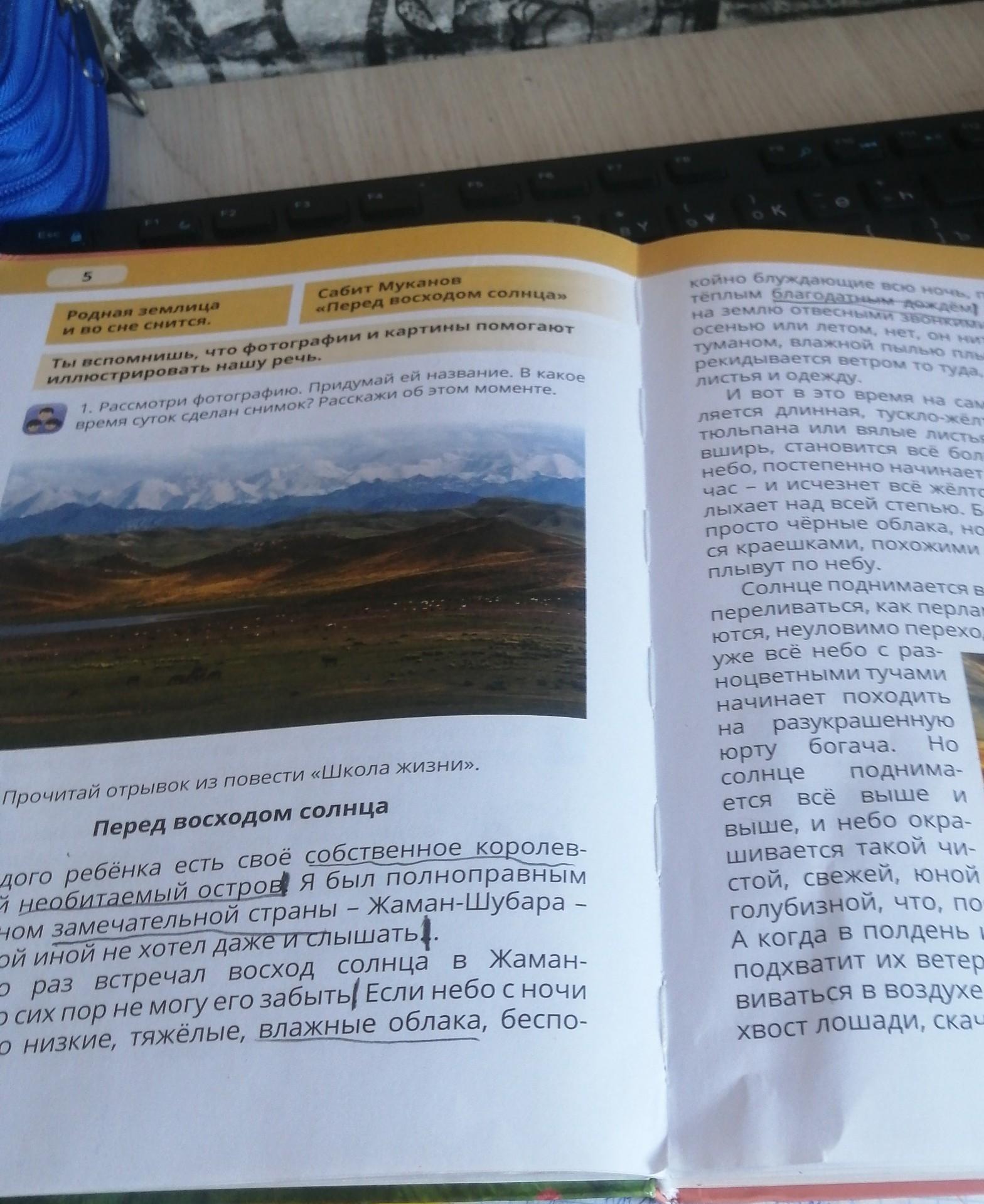 ? 3. Ответь на вопросы по содержанию текста. • О каком «королевстве» рассказывает автор? ● Почему мальчик не хотел слышать ни о какой иной стране? • Опиши чувства, которые испытывает герой произ- ведения. • Каким он видит родной край? Найди в тексте сравнения и эпитеты. Прочитай их. Подбери из текста слова для описания иллюстрации. ● ●