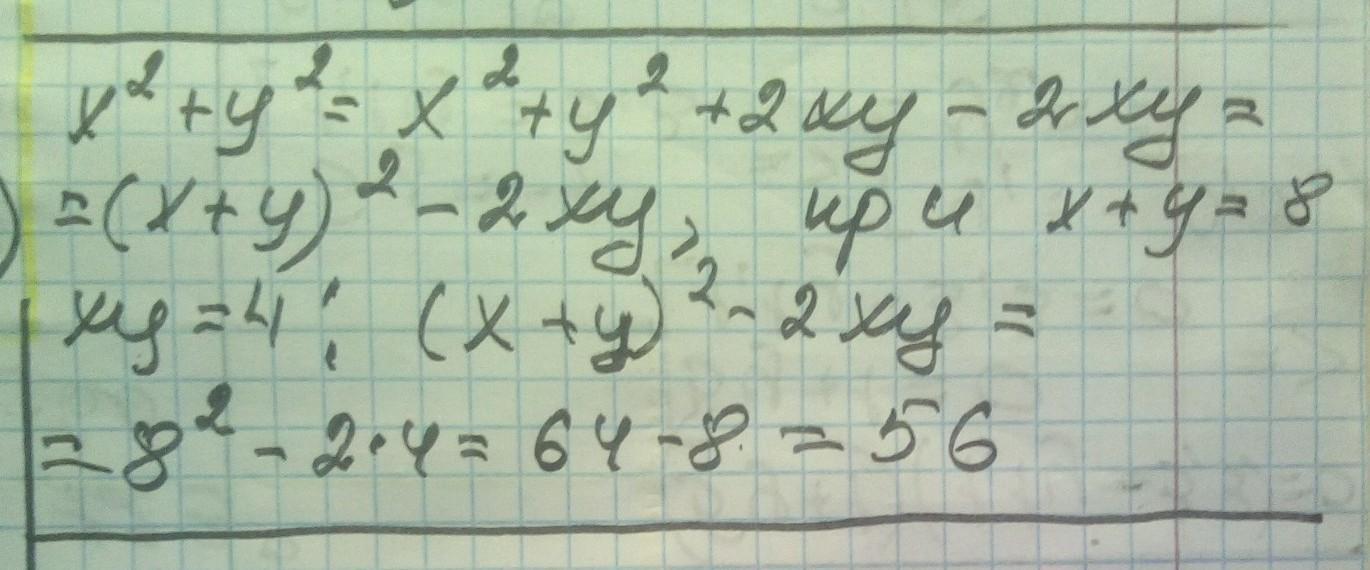 Если x+y=8 , xy=4. То найди x2+y2. Задача по математике. Решите пожалуйста срочно…………..))))))))))))))))))))))))))))))))))))))))))))))