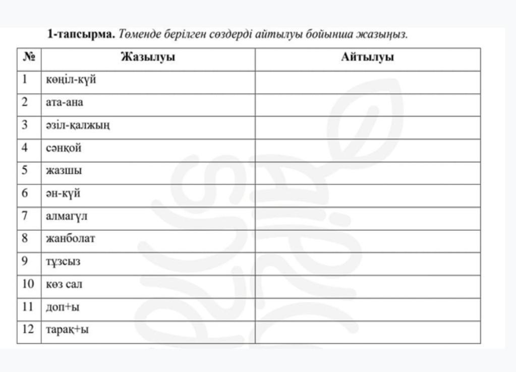 1-тапсырма. Төменде берілген сөздерді айтылуы бойынша жазыныз. Жазылуы Айтылуы №o 1 көңіл-күй 2 ата-ана 3 эзiл-калжың 4 сәнкой 5 6 ән-күй 7 8 жазшы алмагул жанболат 9 тұзсыз 10 көз сал 11 допты 12 | таракты - Ø