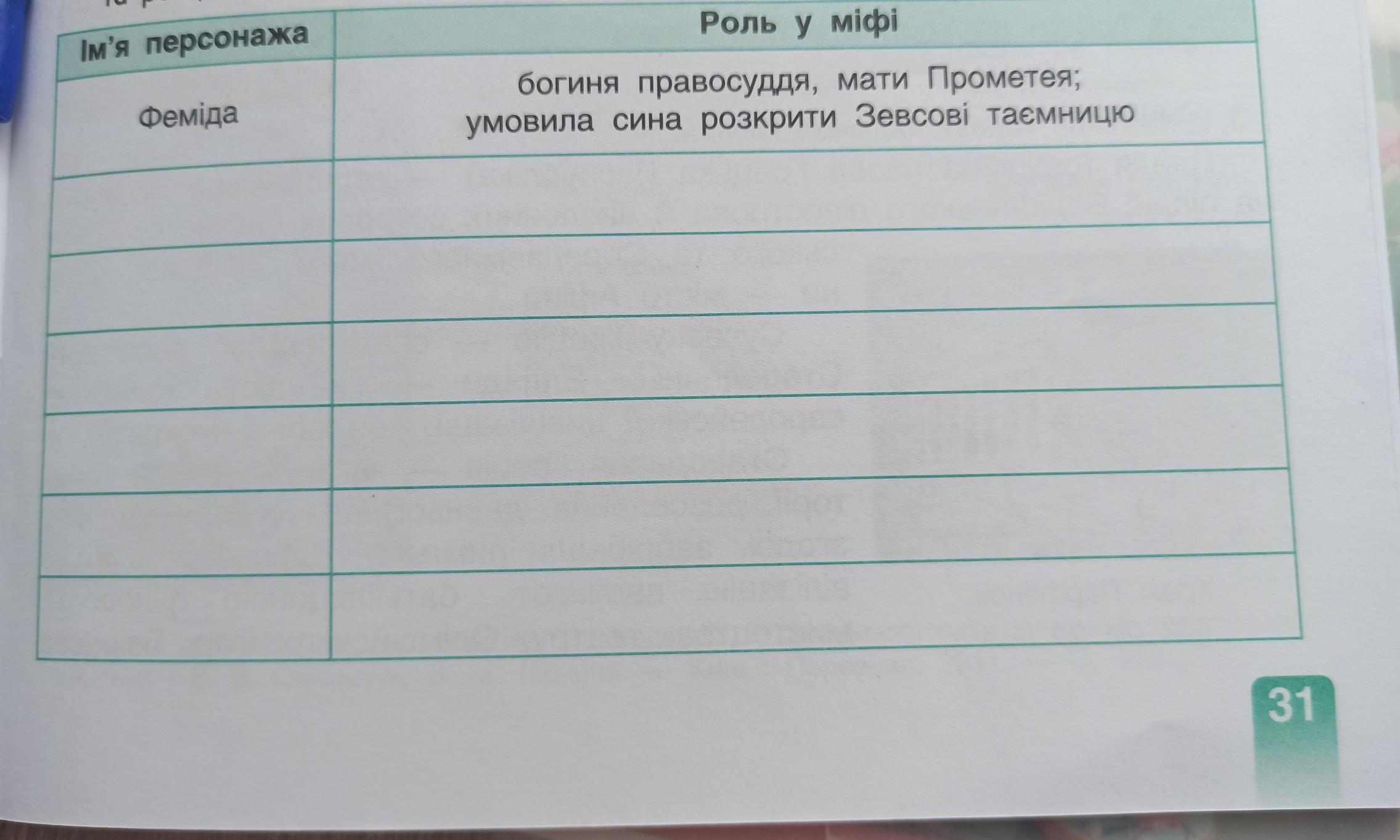 3. Заповни таблицю: упиши імена основних персонажів давньої оповіді «Прометей>> та роль, яку вони виконують у творі.