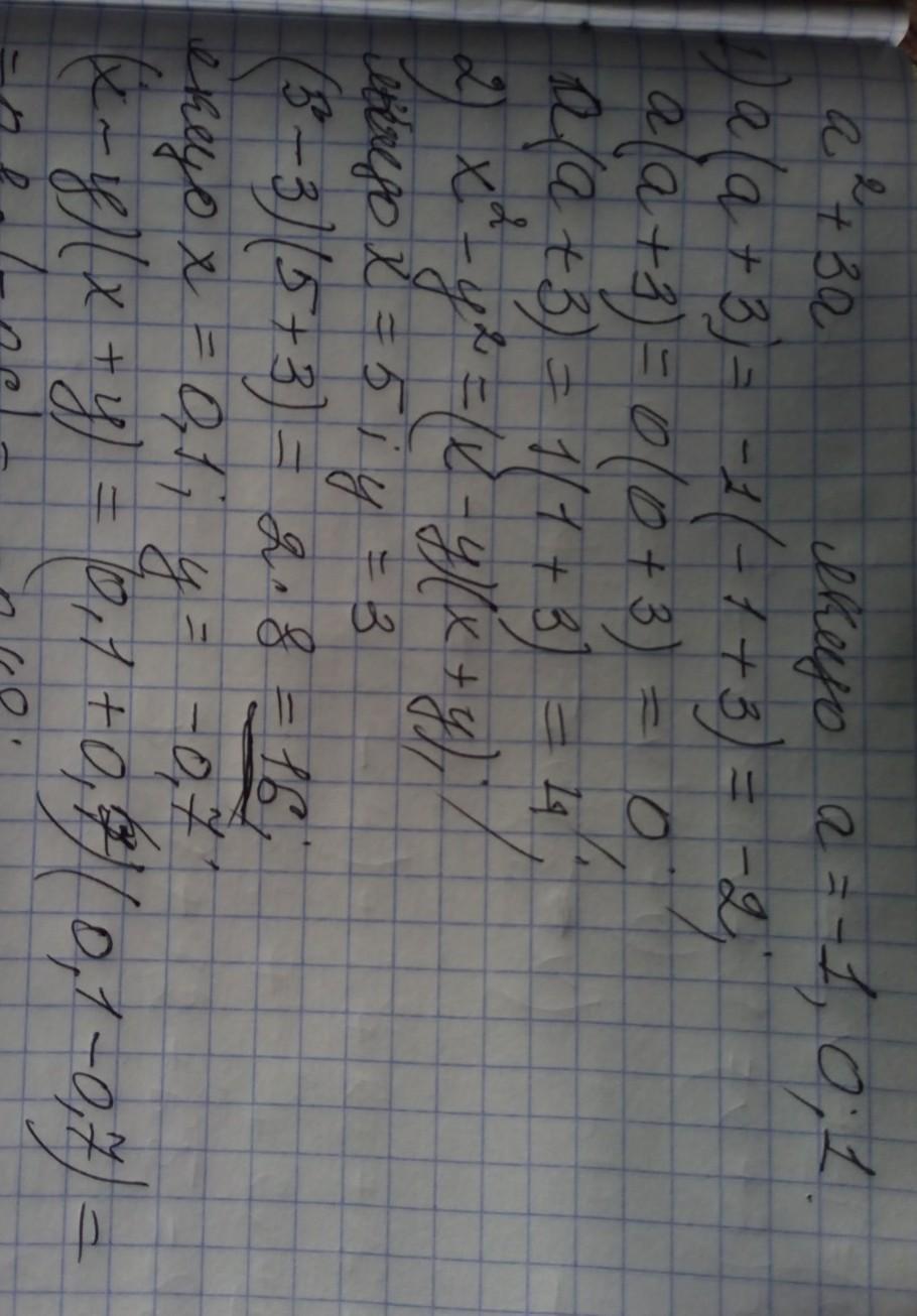439 Знайдіть значення виразу: Розділ 1. Ціл 1) а² + 3а, якщо а = −1; 0; 1; 3. 2) x2— у², якщо x = 5 i y = 3; x = 0,1 i y = −0,7.