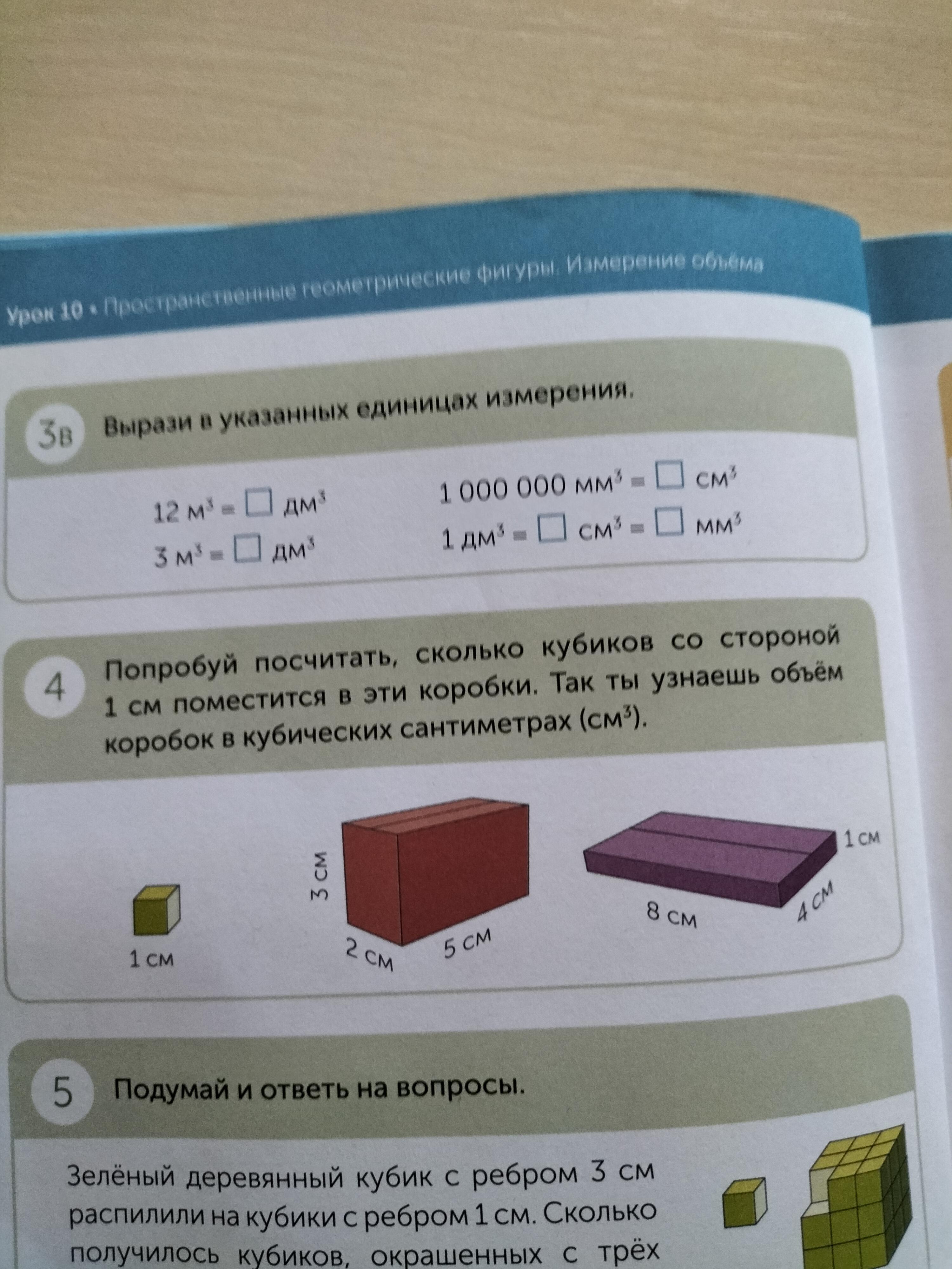 получается во второй коробке 10 кубиков по одному сантиметру и в третьей коробке 13 кубиков по одному сантиметру