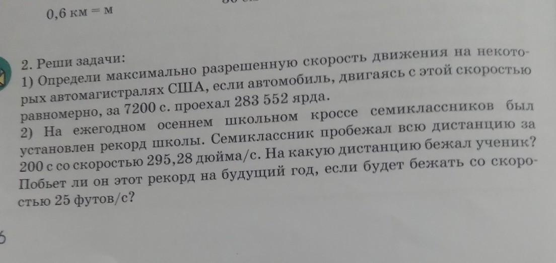 2. Реши задачи: 1) Определи максимально разрешенную скорость движения на некото- рых автомагистралях США, если автомобиль, двигаясь с этой скоростью равномерно, за 7200 с. проехал 283 552 арда. 2) Ha exerодиом осеннем иольиом кроссе сеMикласснииов бBLO установлен рекорд школы. Семиклассник пробежал всю дистанцию за 200 с со скоростью 295,28 дюйма/с. На какую дистанцию бежал ученик? Побьет ли он этот рекорд на будущий год, если будет бежать со скоро- стью 25 футов/с?