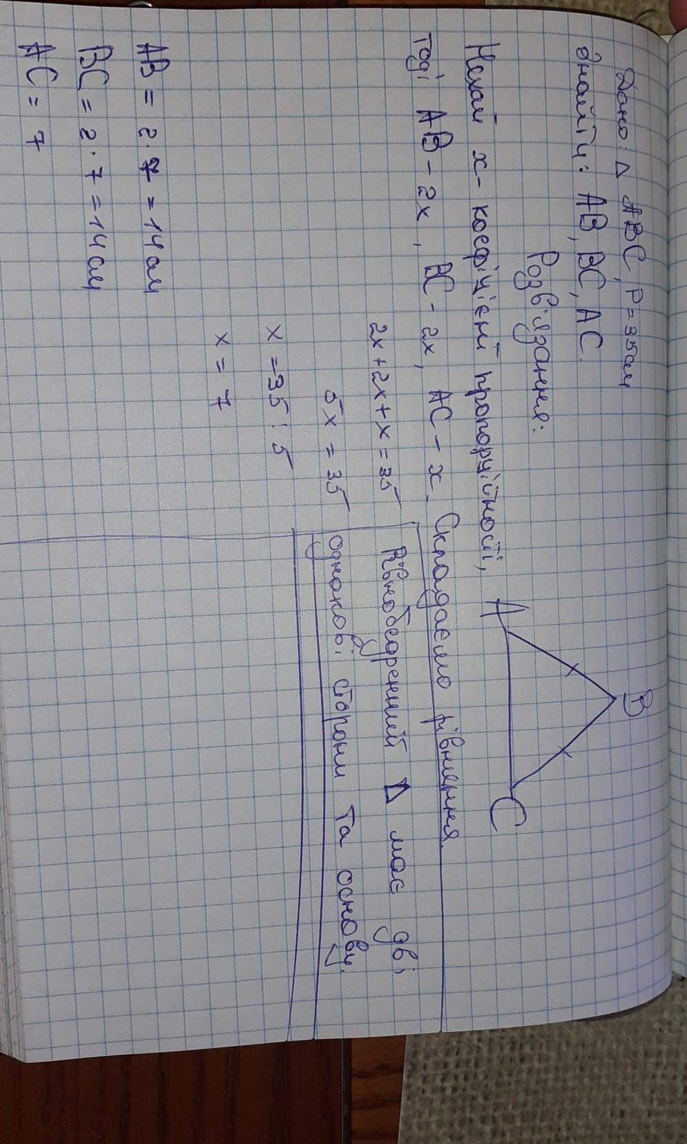 знайти сторони рiвнобедреного трикутника,якщо його пириметр доривнюе 35 см а бична сторона у 2 рази бильше за основу