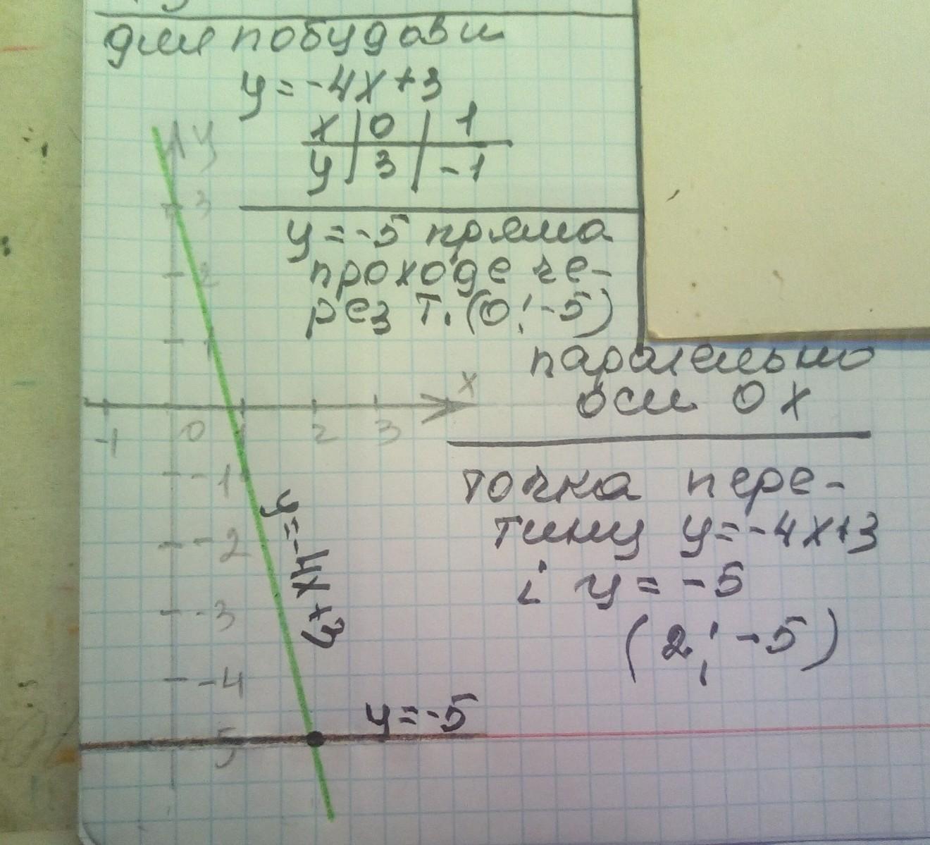 Побудуйте в одній системі координат графіки функцій y = -4x + 3 і y=-5 та знайдіть координати точки їхнього перетину.допоможіть